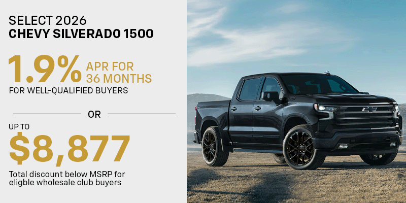 1.9% APR for 36 months for well-qualified buyers when financed w/GM Financial. Monthly payment is $28.60 for every $1000 you finance. Average down payment is 18%. Some customers will not qualify. *$8,877 off MSRP based on stock N26251 with MSRP $69,780, includes $3,877 Supplier discount, $3,250 Customer Cash, $500 Bonus Cash, $1,250 Wholesale Club Incentive. Must be a wholesale club member prior to March 2nd 2026. Not available with lease and some other offers. Not available with lease and some other offers.